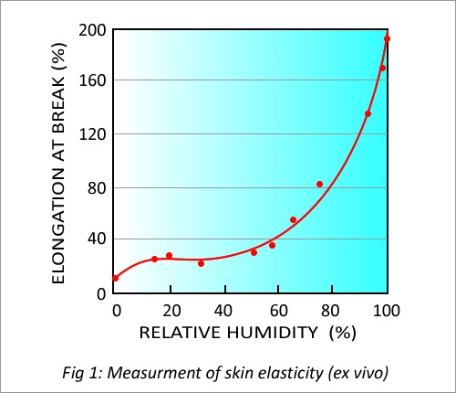 Aici se vede clar că apa servește ca plastifiant și SC devine mai elastic odată cu creșterea RH (aici măsurarea alungirii până la ruperea structurii). Curba se înclină puternic la aproximativ 70% RH (9). Ulterior s-a constatat că RH influențează aranjarea moleculară a peptidelor în filamentele de keratină și valoarea pragului este de 85% RH pentru distanța intercatenului de keratina (10).