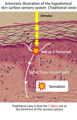 Fibrele nervoase mici cutanate, cum ar fi fibrele C (care mediază durerea, mâncărimea și căldura) sunt echipate cu neuroreceptori senzoriali, cum ar fi Transient Receptor Potential TRP, care pot fi activați de diverși stimuli fizico-chimici și termici, care sunt, de asemenea, exprimați de celula keratinocitelor.